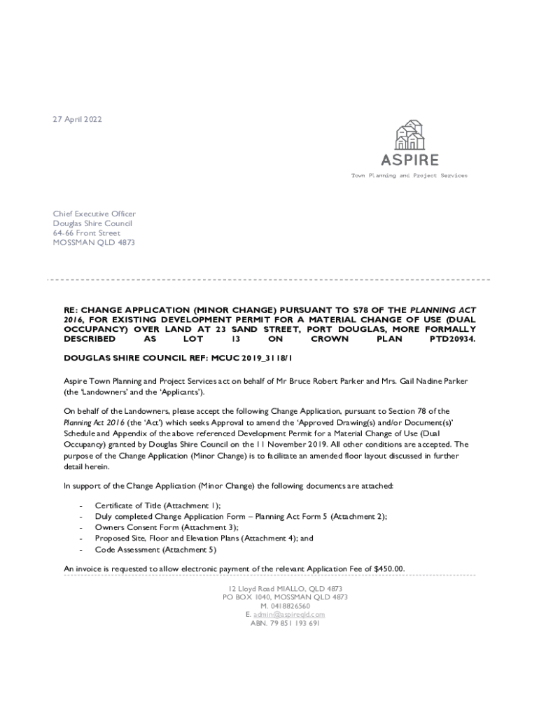 27 April 2022Chief Executive Officer Douglas Shire Council 6466 Front Street OSMAN QLD 4873RE: CHANGE APPLICATION (MINOR CHANGE) PURSUANT TO S78 OF THE PLANNING ACT 2016, FOR EXISTING DEVELOPMENT
