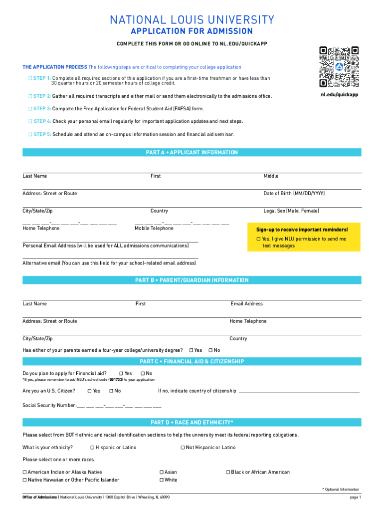 NATIONAL LOUIS UNIVERSITY APPLICATION FOR ADMISSIONCOMPLETE THIS FORM OR GO ONLINE TO NL.EDU/QUICKAPPTHE APPLICATION PROCESS The following steps are critical to completing your college application