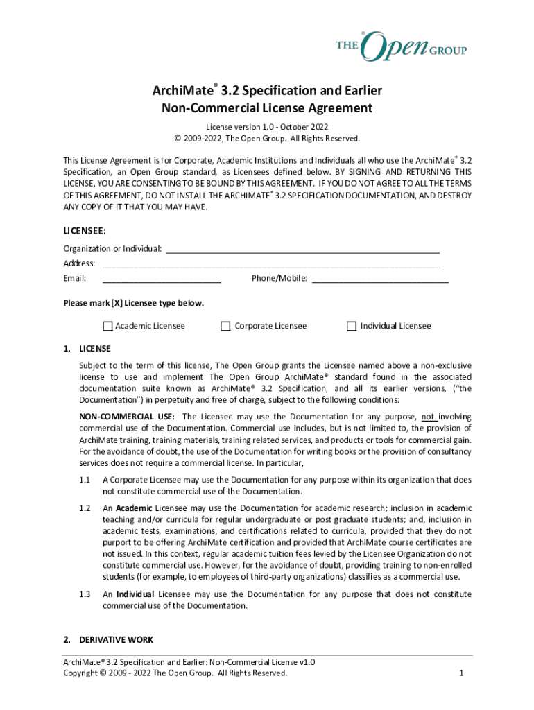 The ArchiMate 3.2 Non-Commercial License can be filled out by visiting the official ArchiMate website and following the instructions provided.
