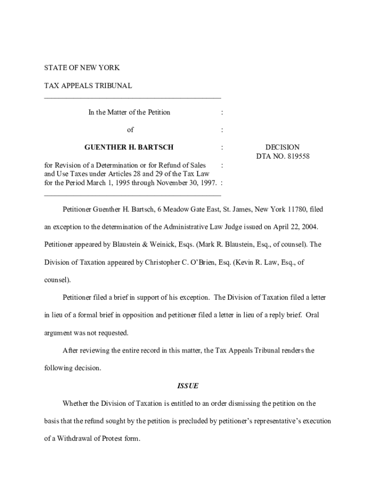 STATE OF NEW YORK TAX APPEALS TRIBUNAL ___ In the Matter of the Petition:of:GUNTHER H. BATCH:DECISION DTA NO. 819558for Revision of a Determination or for Refund of Sales : and Use Taxes under Articles