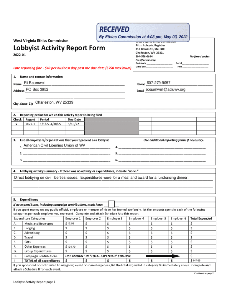 West Virginia Ethics Commission at 4:03 pm, May 03, 2022, West Virginia Ethics Commission Attn: Lobbyist Registrar 210 Brooks St., Ste. 300 Charleston, WV 25301 3045580664Lobbyist Activity Report
