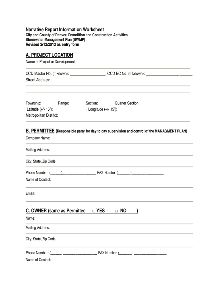 Narrative Report Information WorksheetCity and County of Denver, Demolition and Construction Activities Stormwater Management Plan (SWAMP)Revised 2/12/2013 as entry form. PROJECT Locational of Project