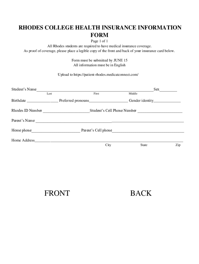 RHODES COLLEGE HEALTH INSURANCE INFORMATION FORM Page 1 of 1 All Rhodes students are required to have medical insurance coverage. As proof of coverage, please place a legible copy of the front and