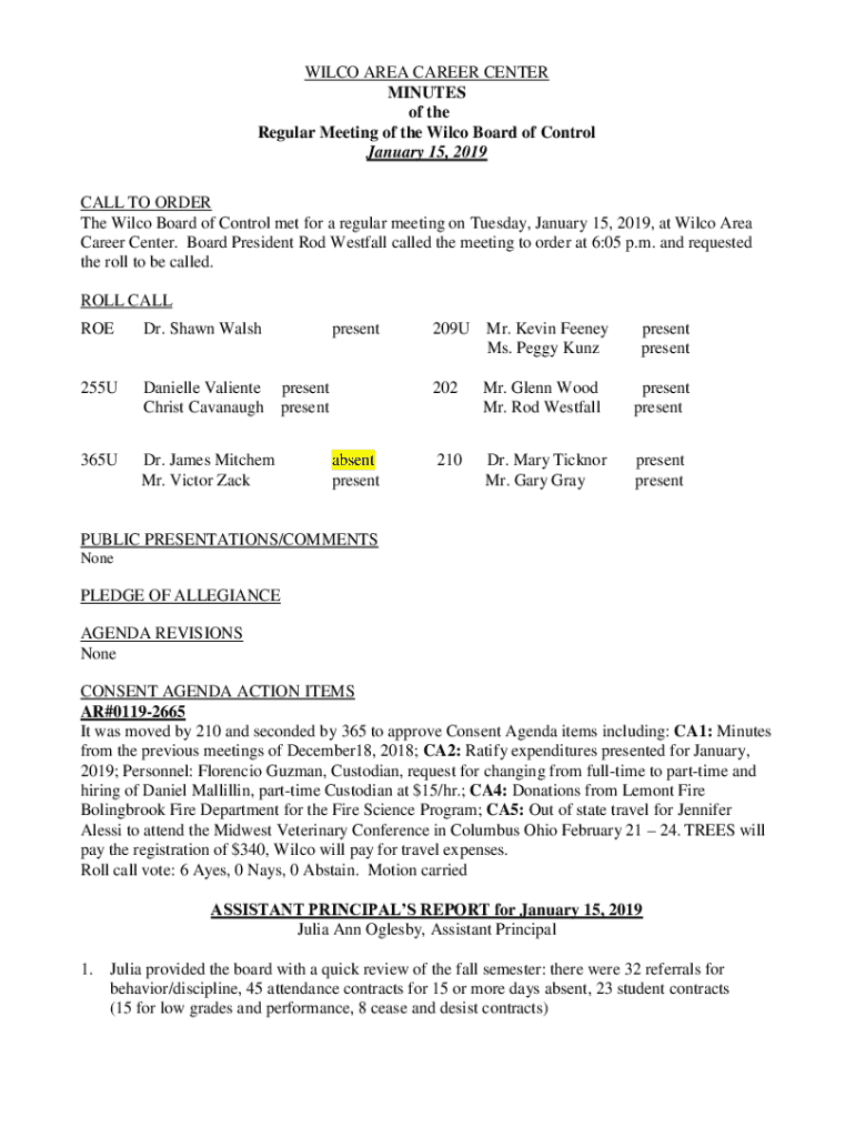 WILCOX AREA CAREER CENTER MINUTES of the Regular Meeting of the Wilcox Board of Control January 15, 2019, CALL TO ORDER The Wilcox Board of Control met for a regular meeting on Tuesday, January 15,