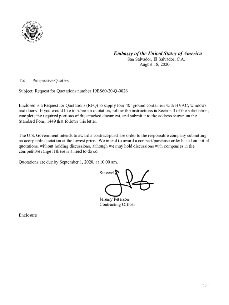 Embassy of the United States of America San Salvador, El Salvador, C.A. August 18, 2020, To:Prospective QuotersSubject: Request for Quotations number 19ES6020Q0026 Enclosed is a Request for Quotations