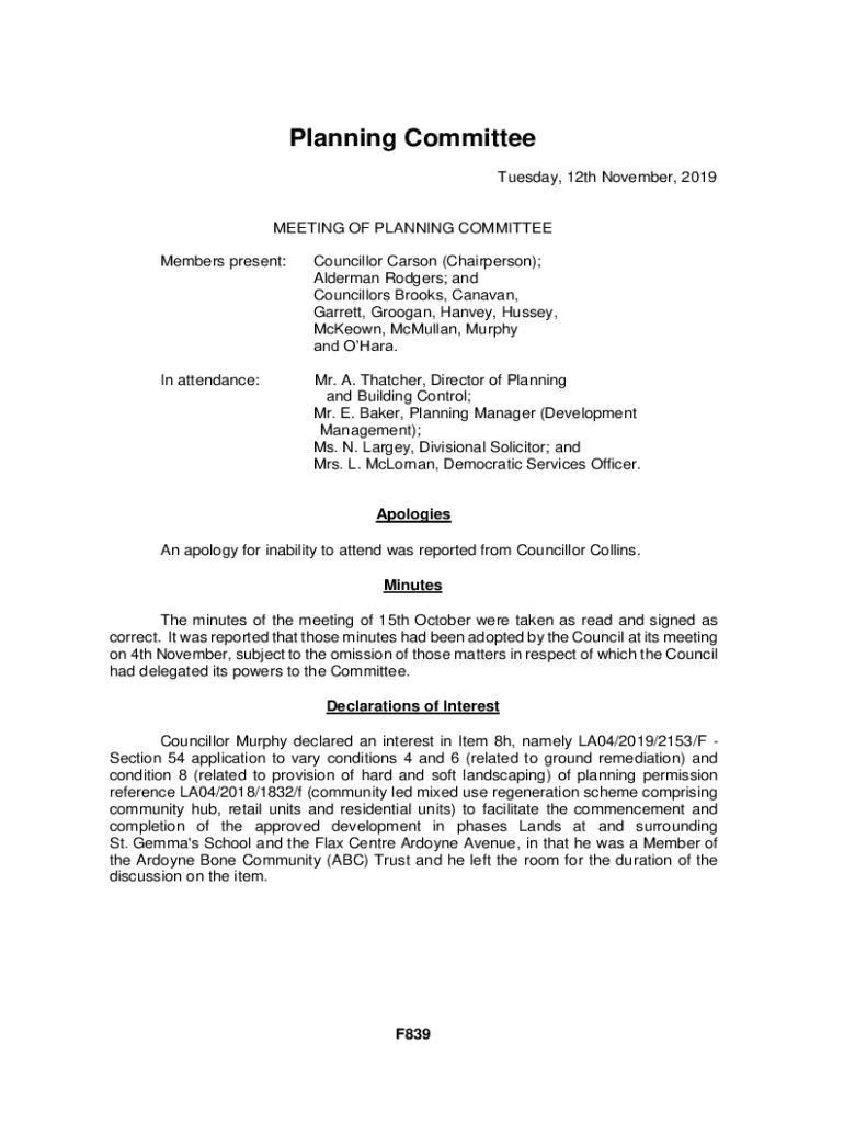 Planning Committee Tuesday, 12th November, 2019MEETING OF PLANNING COMMITTEE Members present:Councillor Carson (Chairperson); Alderman Rodgers; and Councillors Brooks, Caravan, Garrett, Crewman, Harvey,