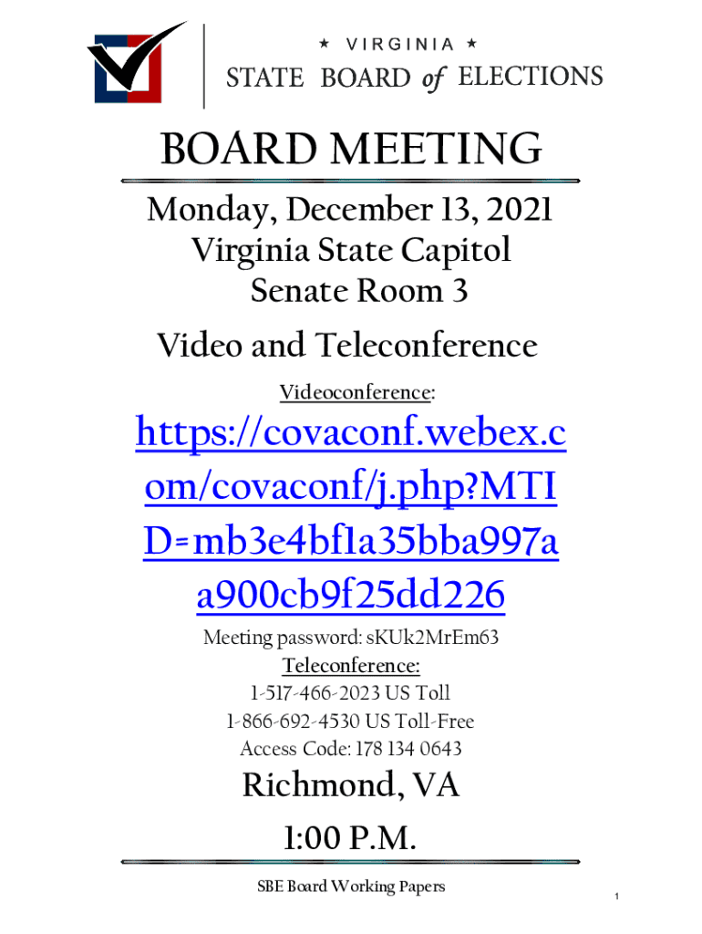 BOARD MEETING Monday, December 13, 2021, Virginia State Capitol Senate Room 3 Video and Teleconference Videoconference:https://covaconf.webex.c on/covalent/j.php?MTV Dmb3e4bf1a35bba997a a900cb9f25dd226