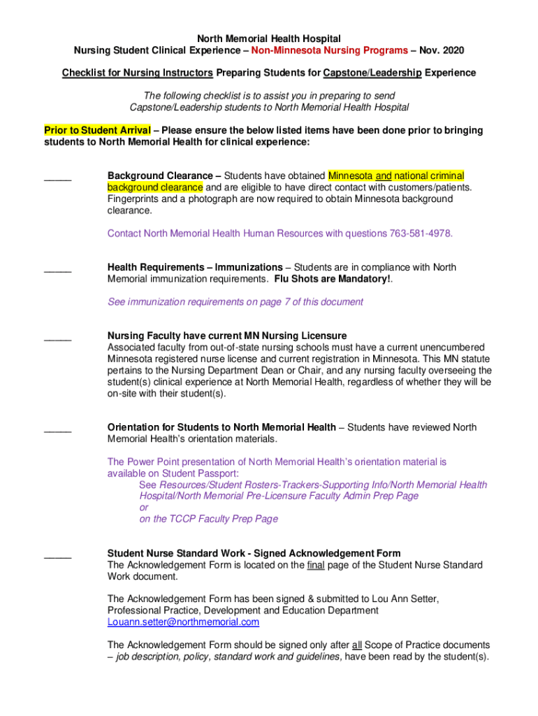 North Memorial Health Hospital Nursing Student Clinical Experience NonMinnesota Nursing Programs Nov. 2020 Checklist for Nursing Instructors Preparing Students for Capstone/Leadership Experience The