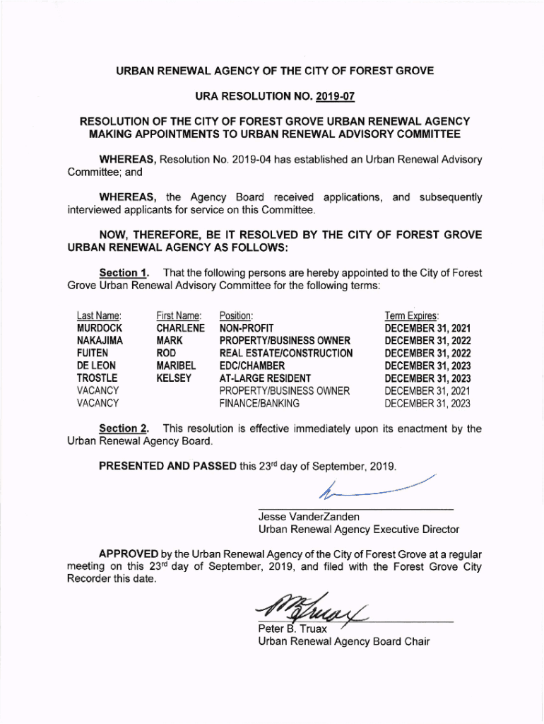 URBAN RENEWAL AGENCY OF THE CITY OF FOREST GROVE URA RESOLUTION NO. 201907 RESOLUTION OF THE CITY OF FOREST GROVE URBAN RENEWAL AGENCY MAKING APPOINTMENTS TO URBAN RENEWAL ADVISORY COMMITTEE WHEREAS,