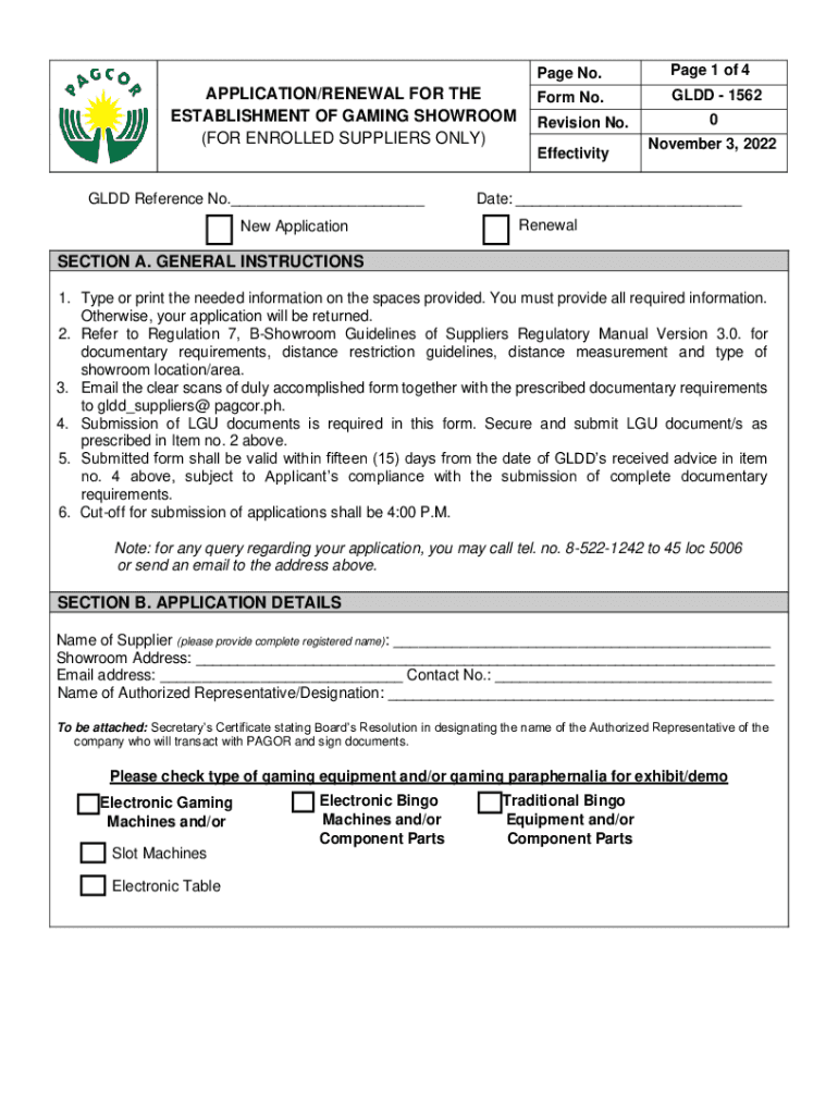 APPLICATION/RENEWAL FOR THE ESTABLISHMENT OF GAMING SHOWROOM (FOR ENROLLED SUPPLIERS ONLY)Page No. Page 1 of 4Form No. GLAD 1562Revision No. EffectivityGLDD Reference No.___ New Application0 November