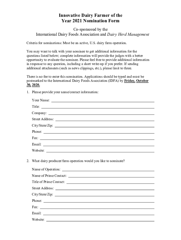 Innovative Dairy Farmer of the Year 2021 Nomination Form Cosponsored by the International Dairy Foods Association and Dairy Herd Management Criteria for nominations: Must be an active, U.S. dairy