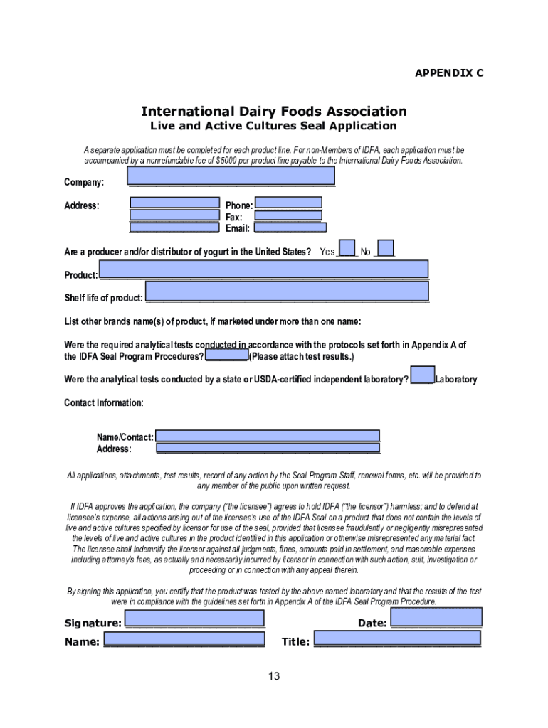 APPENDIX International Dairy Foods Association Live and Active Cultures Seal Application separate application must be completed for each product line. For nonmembers of IDFA, each application must