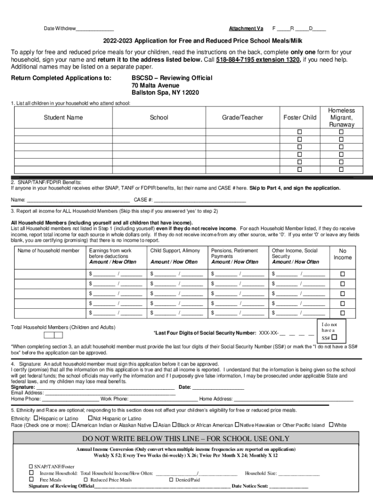 Date Withdrew___Attachment Van ___R ___D___20222023 Application for Free and Reduced Price School Meals/Milk To apply for free and reduced price meals for your children, read the instructions on the