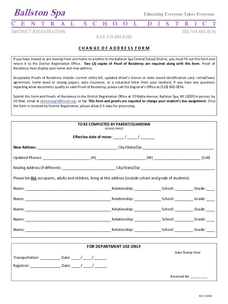 Ballston Spa C EN Educating Everyone Takes Everyone LSC OOLDDISTRICT REGISTRATION STRIP CITED 5186020256 FAX 5188848180 CHANGE OF ADDRESS Formic you have moved or are moving from one home to another