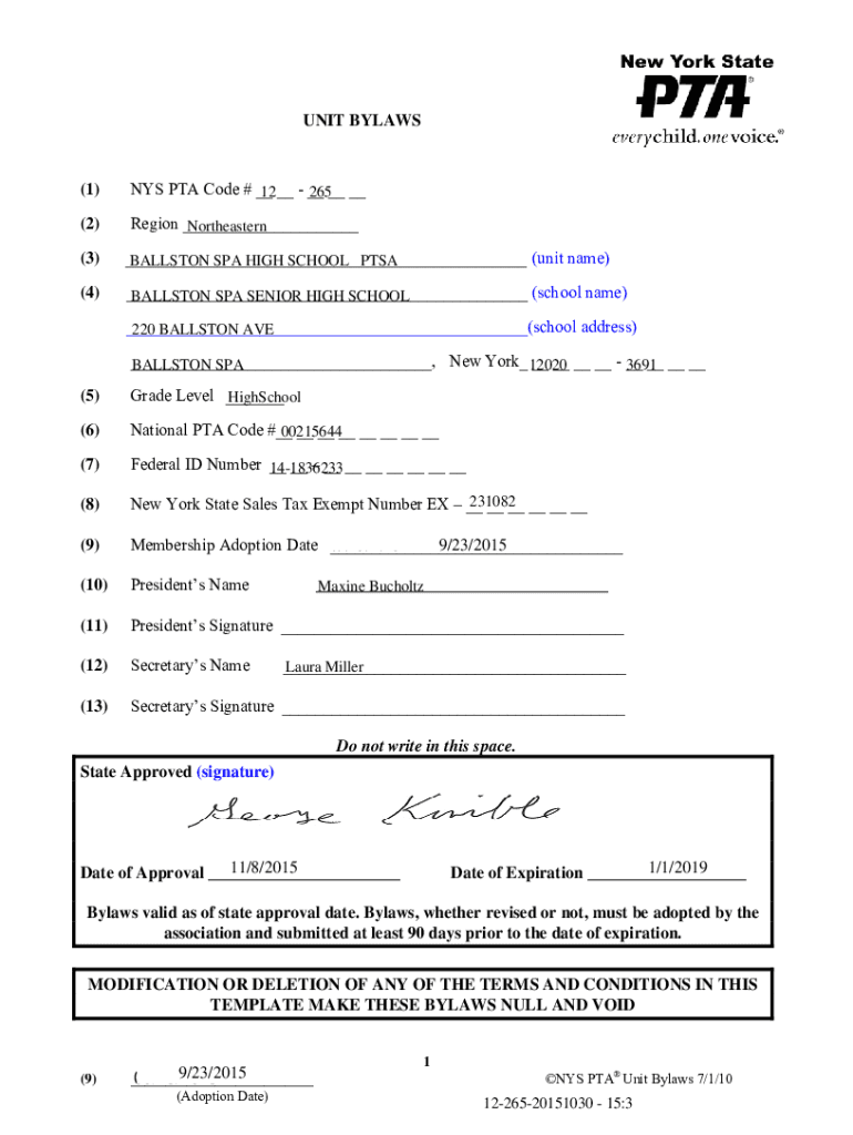UNIT BYLAWS(1)NYS PTA Code # __ 265__ __ 12 __ __(2)Region ___ Northeastern(3)___ (unit name) BALLSTON SPA HIGH SCHOOL PSA(4)___ (school name) BALLSTON SPA SENIOR HIGH SCHOOL ___(school address) 220