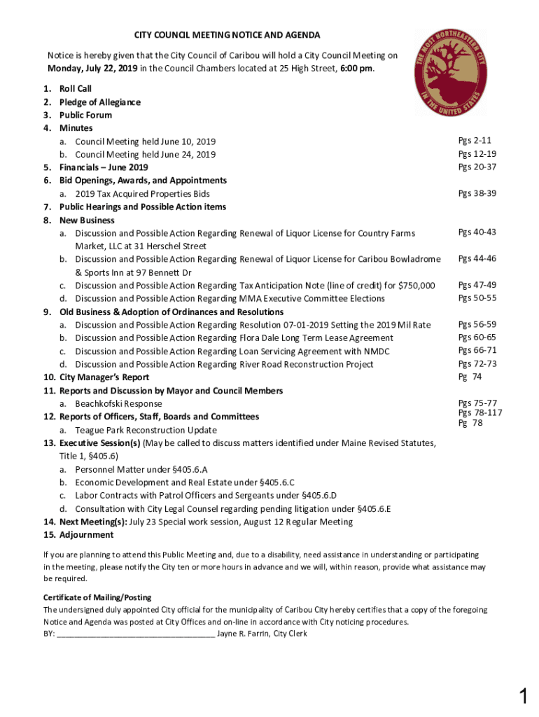 CITY COUNCIL MEETING NOTICE AND AGENDA Notice is hereby given that the City Council of Caribou will hold a City Council Meeting on Monday, July 22, 2019, in the Council Chambers located at 25 High