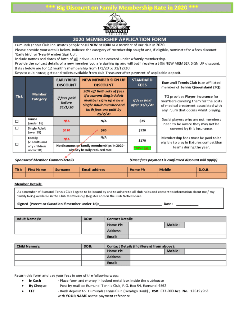 2020 MEMBERSHIP APPLICATION FORM Edmund Tennis Club Inc. invites people to RENEW or JOIN as a member of our club in 2020. Please provide your details below, indicate the category of membership sought