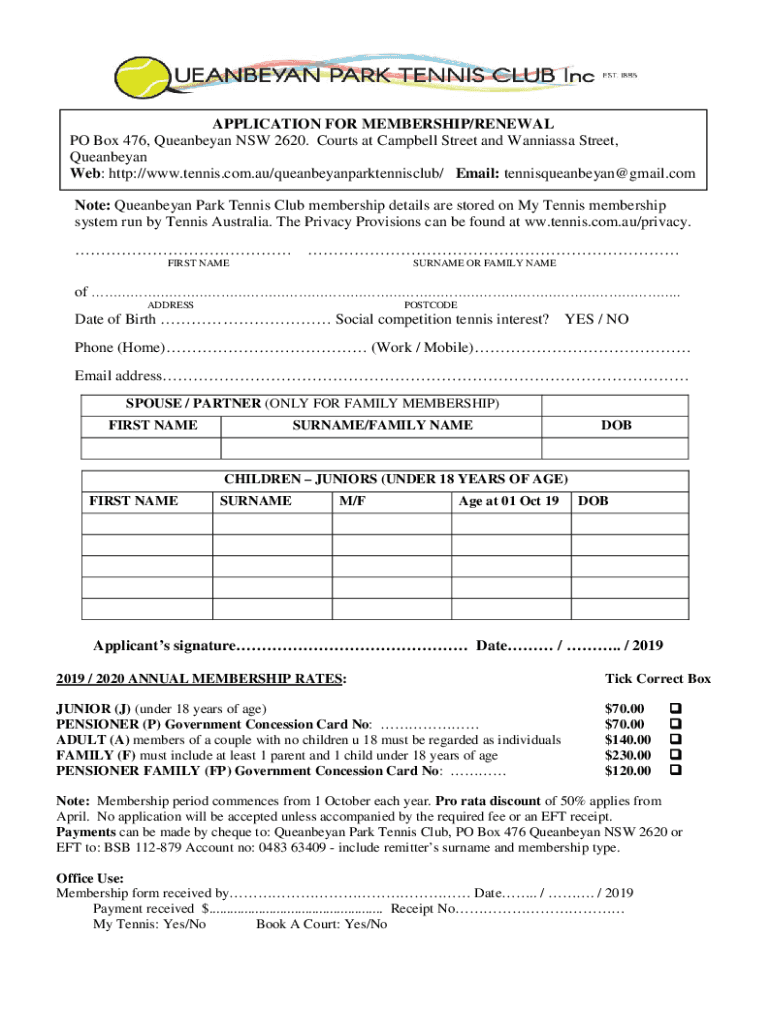 APPLICATION FOR MEMBERSHIP/RENEWAL PO Box 476, Queanbeyan NSW 2620. Courts at Campbell Street and Mantissa Street, Queanbeyan Web: http://www.tennis.com.au/queanbeyanparktennisclub/ Email: tennisqueanbeyan@gmail.com