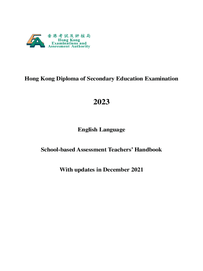 Hong Kong Diploma of Secondary Education Examination2023English LanguageSchoolbased Assessment Teachers HandbookWith updates in December 2021TABLE OF CONTENTS Page 1PrefaceNotes on Changes to the