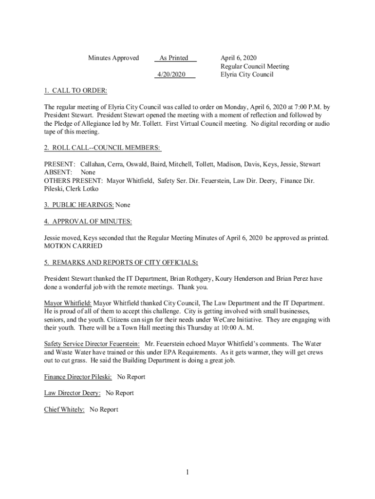 Minutes Approved As Printed 4/20/2020April 6, 2020 Regular Council Meeting Elyria City Council1. CALL TO ORDER: The regular meeting of Elyria City Council was called to order on Monday, April 6, 2020,