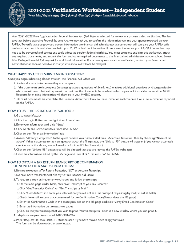 20212022 Verification Worksheet Independent Student Sweet Brian, Virginia 24595 (800) 3816156 Fax: (434) 3816450 financialaid@sbc.edu SBC.your 20212022 Free Application for Federal Student Aid (FAFSA)