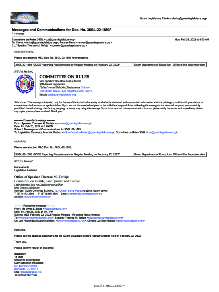 Doc. No. 36GL221693.×Doc. No. 36GL221693.×COMMITTEE ON RULES RECEIVED: February 28, 2022 8:00 A.M. Doc. No. 36GL221693.×DEPARTMENT OF EDUCATION OFFICE OF THE SUPERINTENDENT www.gdoe.net 501 Mariner