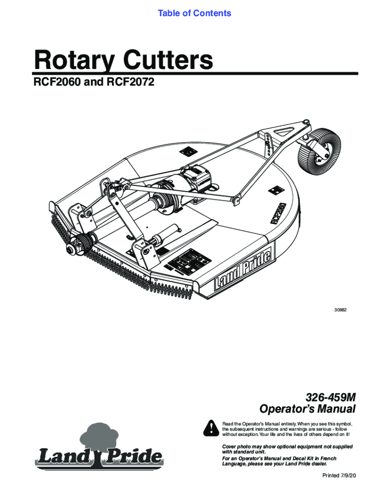 Table of ContentsRotary Cutters RCF2060 and RCF207230982326459M Operators Manual! Read the Operators Manual entirely. When you see this symbol, the subsequent instructions and warnings are serious