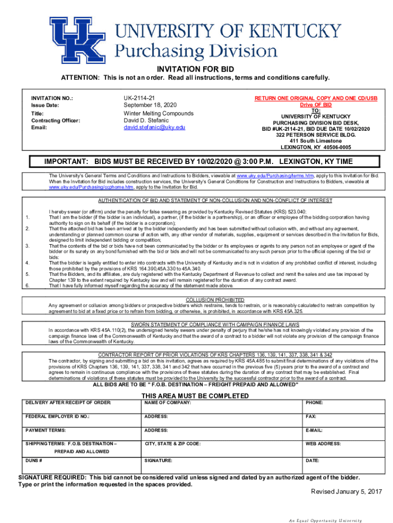 INVITATION FOR INATTENTION: This is not an order. Read all instructions, terms and conditions carefully. UK211421 September 18, 2020, Winter Melting Compounds David D. Stephanie david.stefanic@uky.eduINVITATION