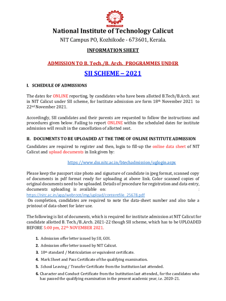 National Institute of Technology Cali cut NIT Campus PO, Kozhikode 673601, Kerala. INFORMATION SHEET ADMISSION TO B. Tech./B.Arch. Programs UNDER SII SCHEME 2021 I. SCHEDULE OF ADMISSIONS The dates