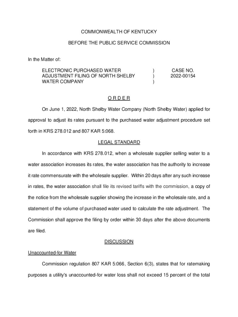COMMONWEALTH OF KENTUCKY BEFORE THE PUBLIC SERVICE Commissioning the Matter of: ELECTRONIC PURCHASED WATER ADJUSTMENT FILING OF NORTH SHELBY WATER COMPANY)))CASE NO. 202200154ORDER On June 1, 2022,