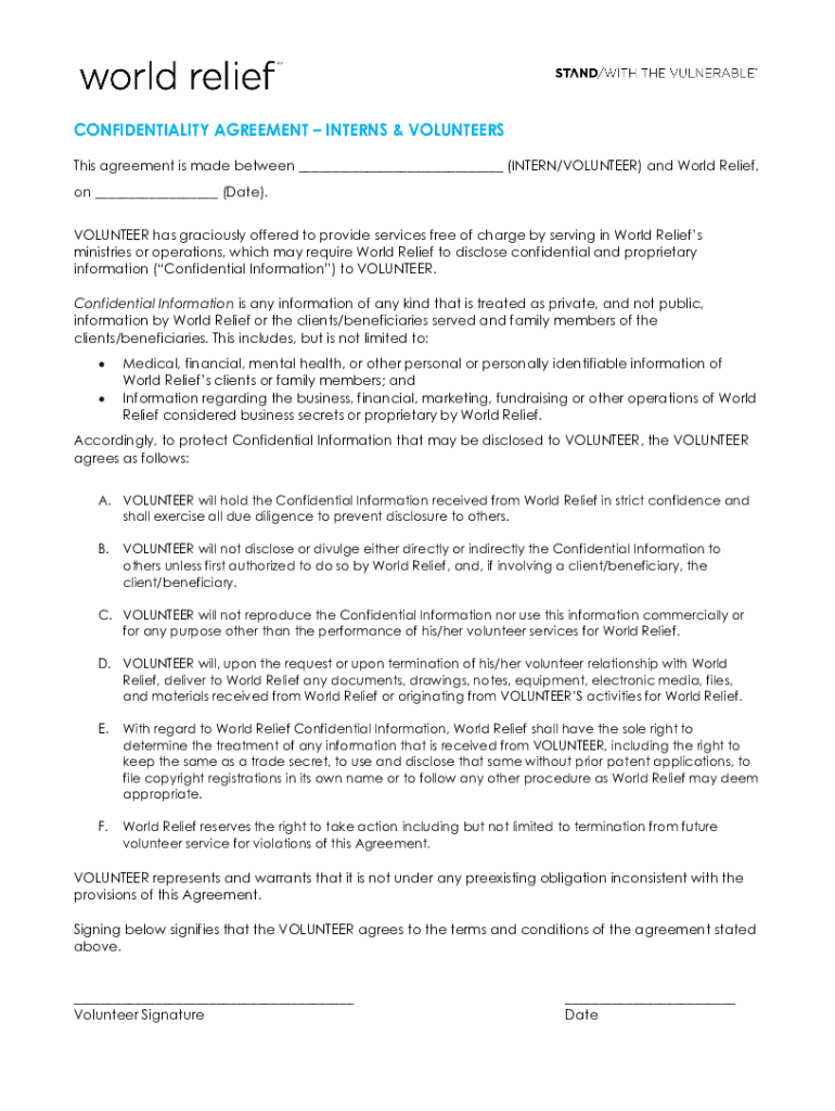 CONFIDENTIALITY AGREEMENT INTERNS & VOLUNTEERS This agreement is made between ___ (INTERN/VOLUNTEER) and World Relief, on ___ (Date). VOLUNTEER has graciously offered to provide services free of charge