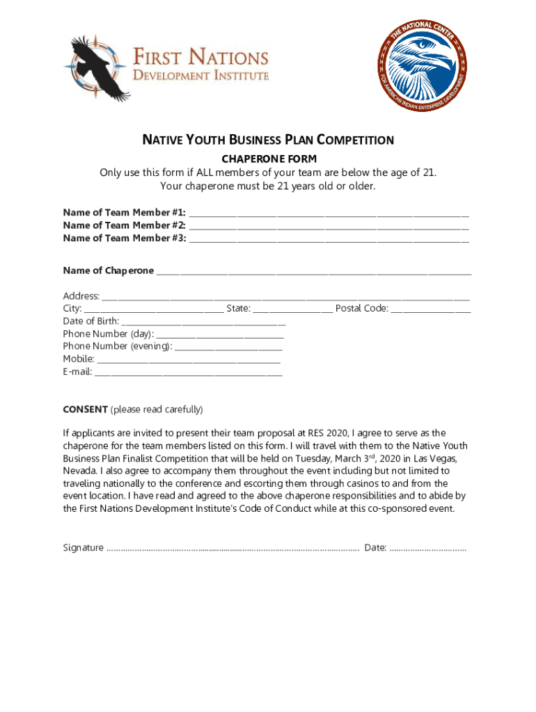 NATIVE YOUTH BUSINESS PLAN COMPETITION CHAPERONE FORM Only use this form if ALL members of your team are below the age of 21. Your chaperone must be 21 years old or older. Name of Team Member #1: