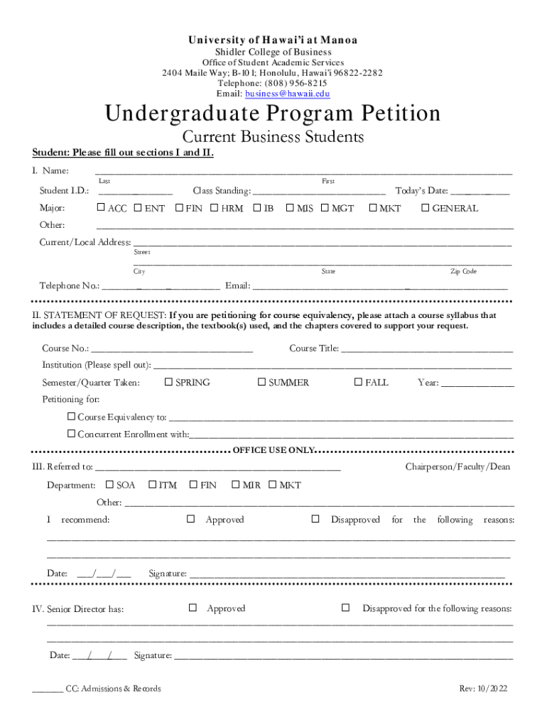 Get the free Business Student Petition Form 2012NEW.doc - shidler hawaii