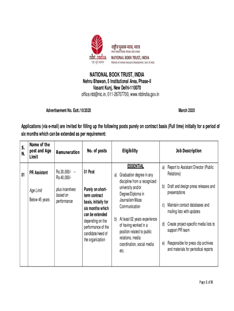 office.nbt@nic.in, 01126707700, www.nbtindia.gov.in