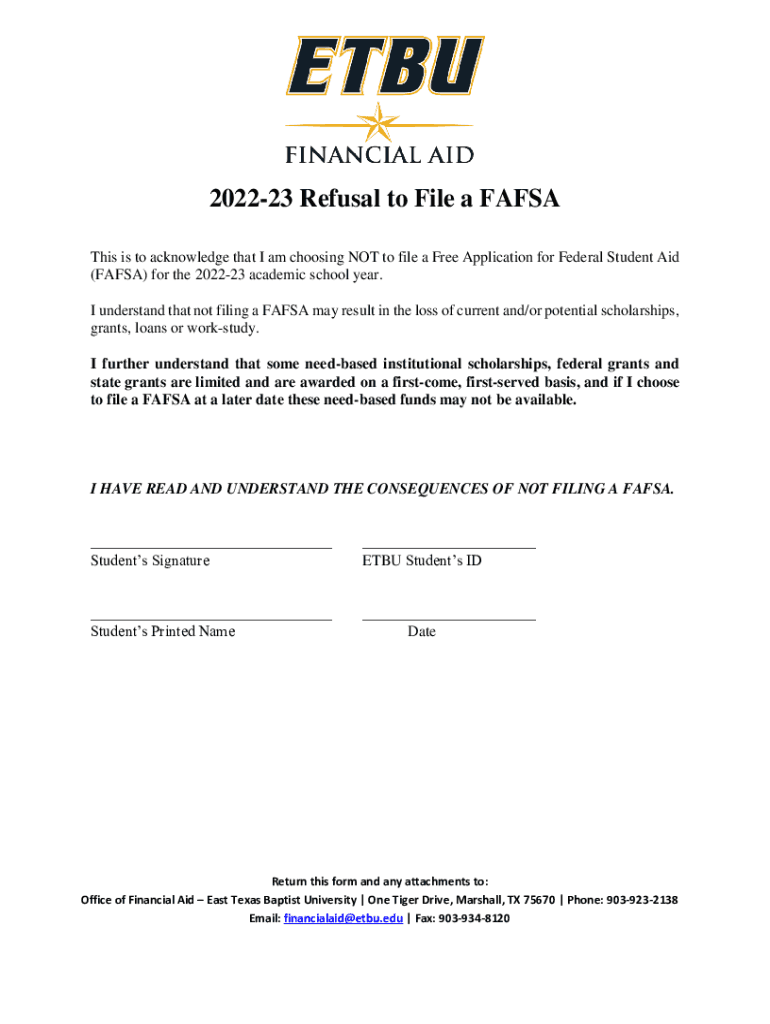 202223 Refusal to File a FAFSA This is to acknowledge that I am choosing NOT to file a Free Application for Federal Student Aid (FAFSA) for the 202223 academic school year. I understand that not filing