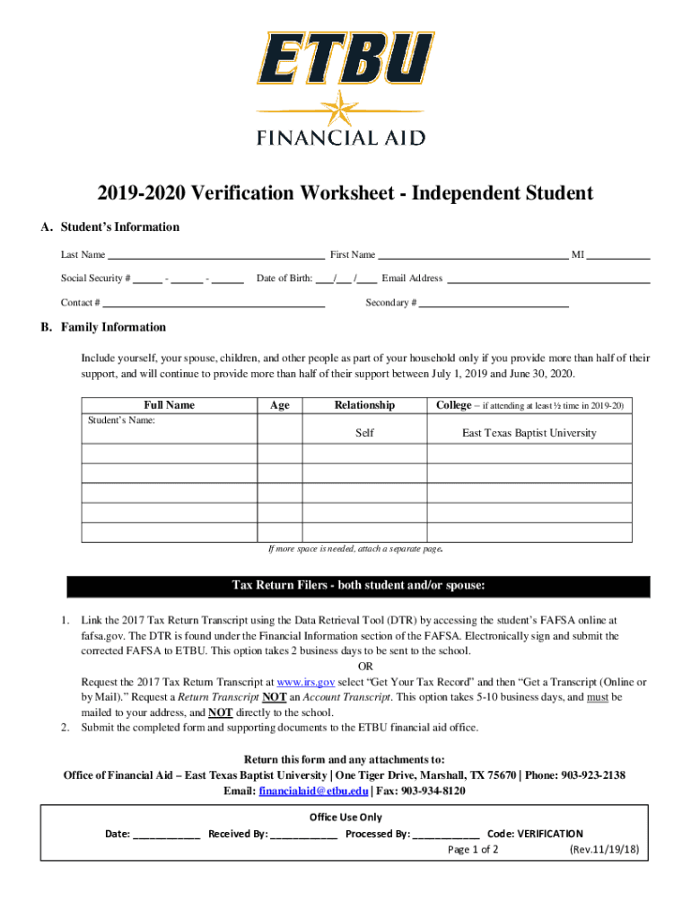 20192020 Verification Worksheet Independent Student FAQs Your 20192020 FAFSA was selected for verification, a process in which the financial aid office must obtain documentation to ensure accuracy