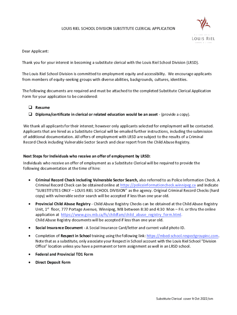 SUBSTITUTE TEACHING EMPLOYMENT APPLICATION LOUIS RIEL SCHOOL DIVISION SUBSTITUTE CLERICAL APPLICATIONDear Applicant: Thank you for your interest in becoming a substitute clerical with the Louis Riel