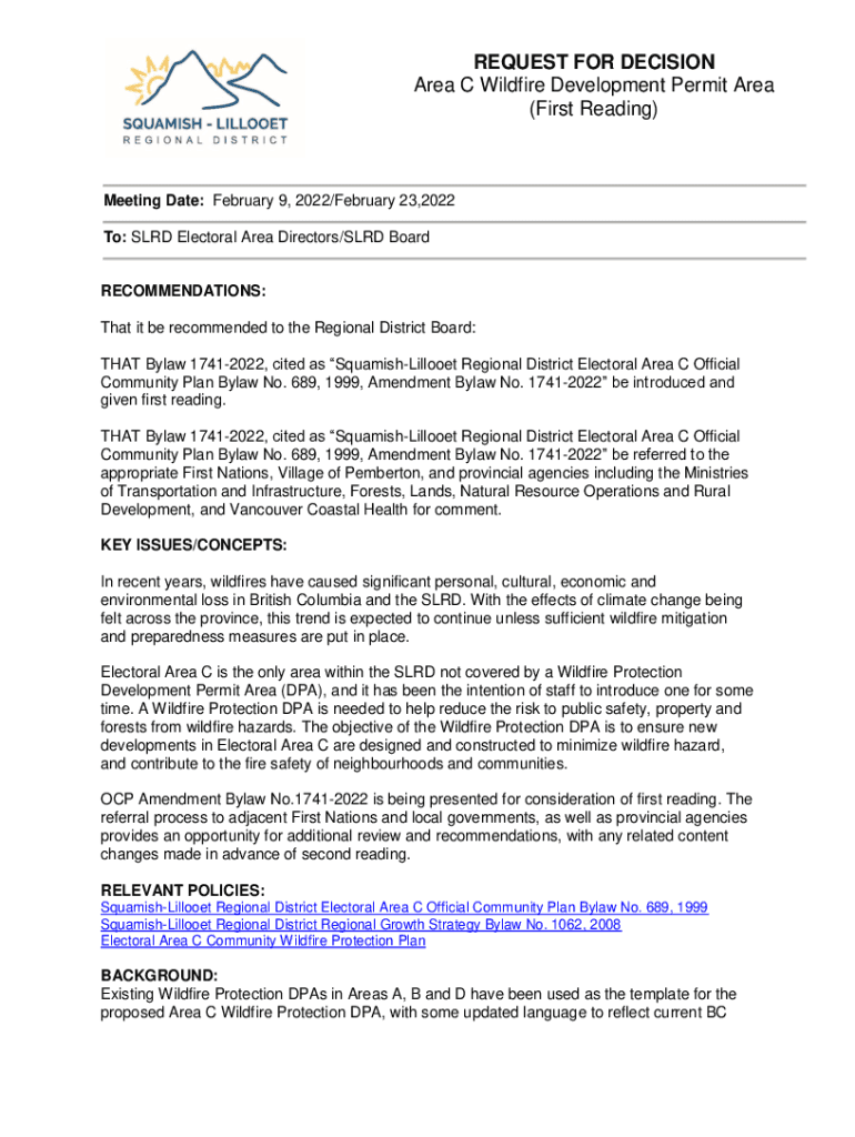 REQUEST FOR DECISION Area C Wildfire Development Permit Area (First Reading)Meeting Date: February 9, 2022/February 23, 2022, To: SLR Electoral Area Directors/SLR BoardRECOMMENDATIONS: That it be