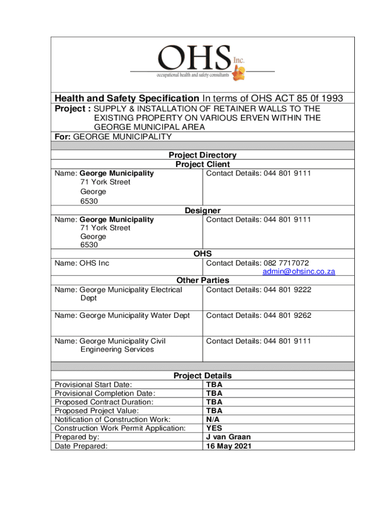 Health and Safety Specification In terms of OHS ACT 85 0f 1993 Project : SUPPLY & INSTALLATION OF RETAINER WALLS TO THE EXISTING PROPERTY ON VARIOUS EVEN WITHIN THE GEORGE MUNICIPAL AREA For: GEORGE