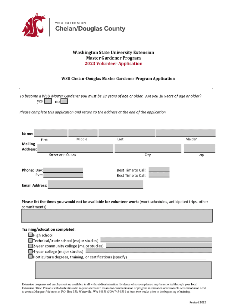 Washington State University Extension Master Gardener Program 2023 Volunteer Application WSU ChelanDouglas Master Gardener Program Application become a WSU Master Gardener you must be 18 years of