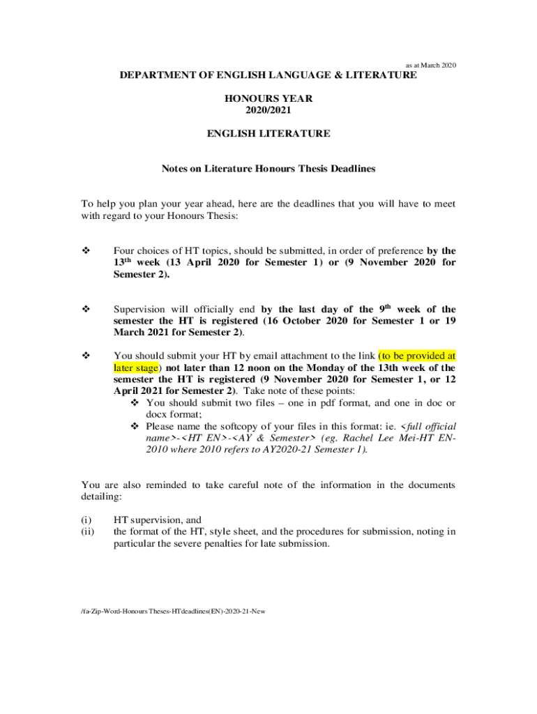 As at March 2020DEPARTMENT OF ENGLISH LANGUAGE & LITERATURE Honors YEAR 2020/2021 ENGLISH LITERATURENotes on Literature Honors Thesis The Deadliest help you plan your year ahead, here are the deadlines
