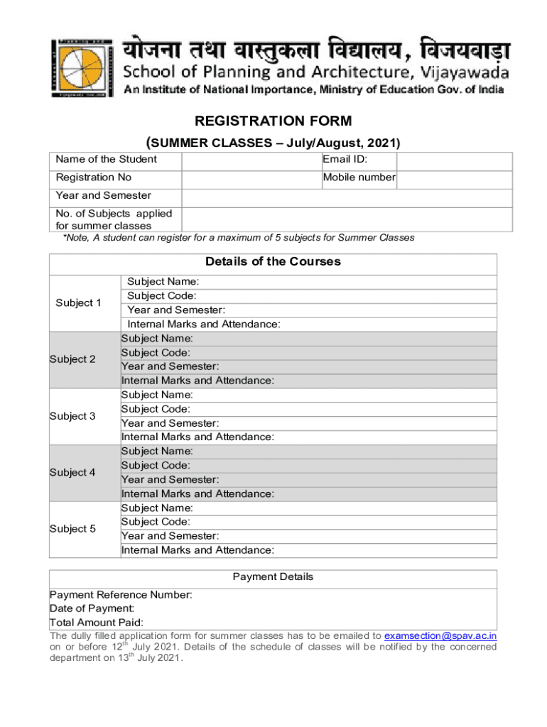 REGISTRATION FORM (SUMMER CLASSES July/August 2021) Name of the StudentEmail ID:Registration No Mobile lumberyard and Semester No. of Subjects applied for summer classes *Note, A student can register