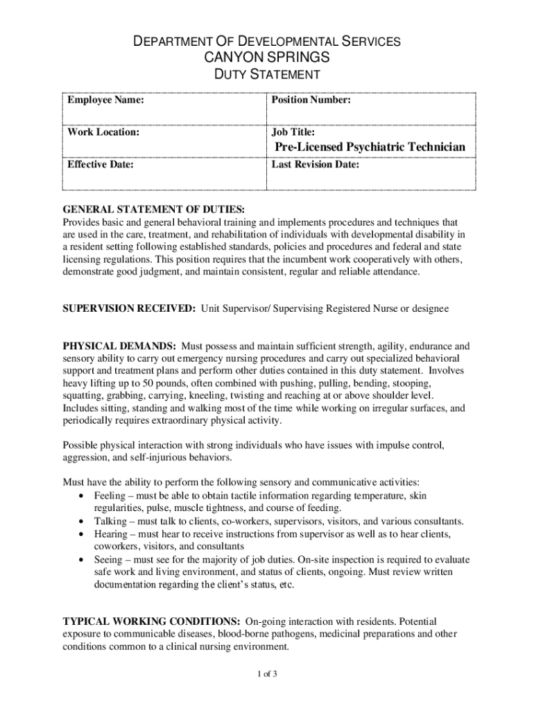 DEPARTMENT OF DEVELOPMENTAL SERVICES CANYON SPRINGS DUTY STATEMENT Employee Name:Position Number:Work Location:Job Title:Licensed Psychiatric Technician Effective Date:Last Revision Date:GENERAL STATEMENT