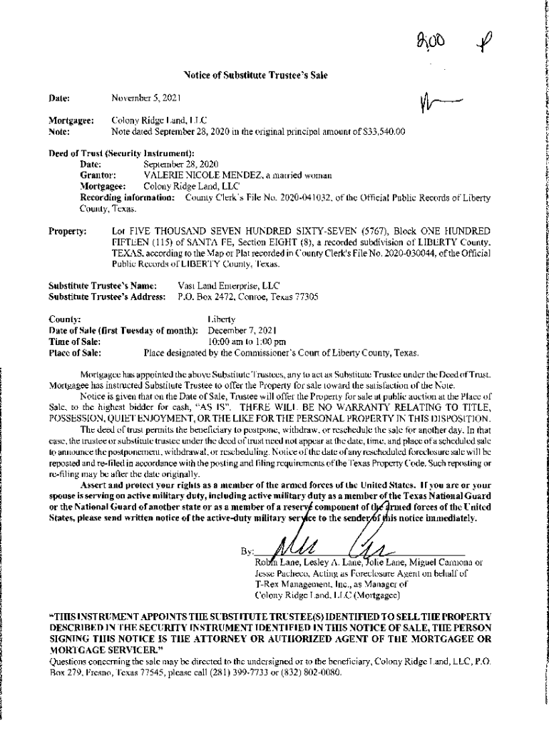 Notice of Substitute Trustee\'s Sale Date:November 5, 2021Mortgagee: Note:Colony Ridge Land, LLC Note dated September 28, 2020, in the original principal amount of $33,540.00Deed of Trust (Security