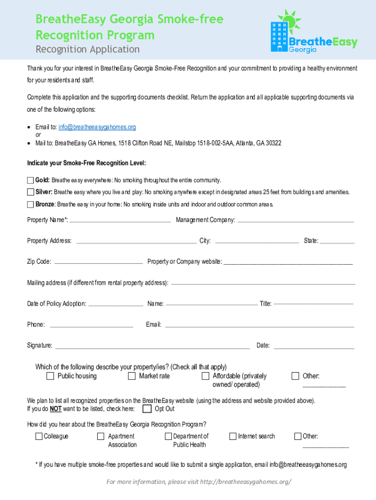 Breathes Georgia Smoke free Recognition Program Recognition Application Thank you for your interest in Breathes Georgia Smoke-free Recognition and your commitment to providing a healthy environment