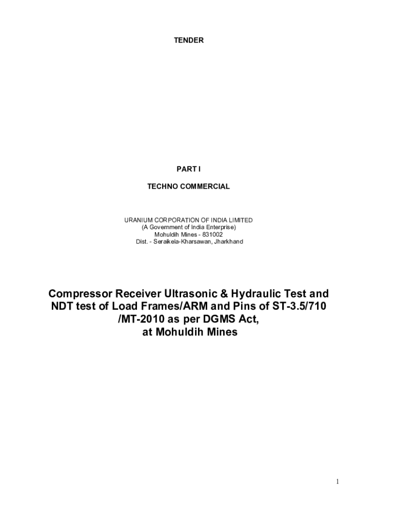 UNDERPART I TECHNO COMMERCIALURANIUM CORPORATION OF INDIA LIMITED (A Government of India Enterprise) Mauldin Mines 831002 Dist. SeraikelaKharsawan, JharkhandCompressor Receiver Ultrasonic & Hydraulic