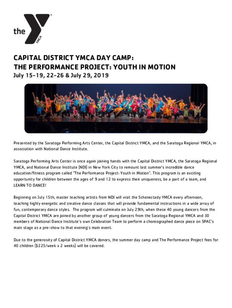 CAPITAL DISTRICT YMCA DAY CAMP: THE PERFORMANCE PROJECT: YOUTH IN MOTION July 1519, 2226 & July 29, 2019Presented by the Saratoga Performing Arts Center, the Capital District YMCA, and the Saratoga