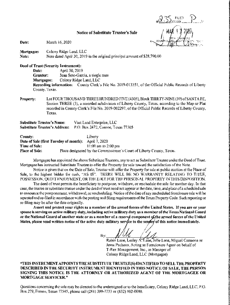 Notice of Substitute Trustee\'s Sale Date:March 16, 2020Mortgagee: Note:Colony Ridge Land, LLC Note dated April 30, 2019, in the original principal amount of $28,790.00Deed of Trust (Security Instrument):