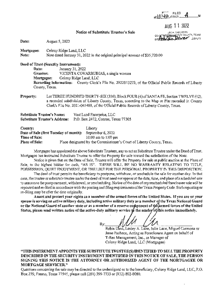 R\'\'at): \'I DEFILED o\'clock _\”.4_ _AUG \') 1 2022 Notice of Substitute Trustee\'s Sale Date:August 5, 2022Mortgagee: Note:Colony Ridge Land, LLC Note dated January 31, 2022, in the original