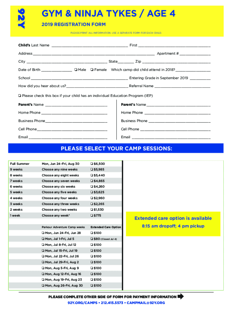 GYM & NINJA TYKES / AGE 4 2019 REGISTRATION FORM PLEASE PRINT ALL INFORMATION. USE A SEPARATE FORM FOR EACH CHILD. Child's Last Name___ First___ Address___ Apartment #___ City___ State___ Zip___ Date
